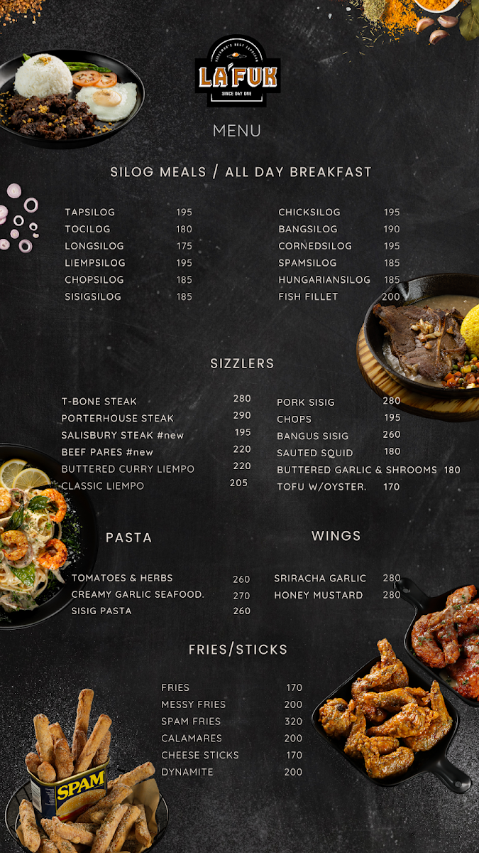 The menu at LAFUK offers a straightforward selection of comforting Filipino favorites and casual bites, ideal for anytime meals from breakfast through late night. You’ll find hearty silog dishes like Bangsilog, Longsilog, and Tocilog that pair fragrant garlic rice and perfectly cooked eggs with tender meats, providing a satisfying start to the day or a familiar late-night option.